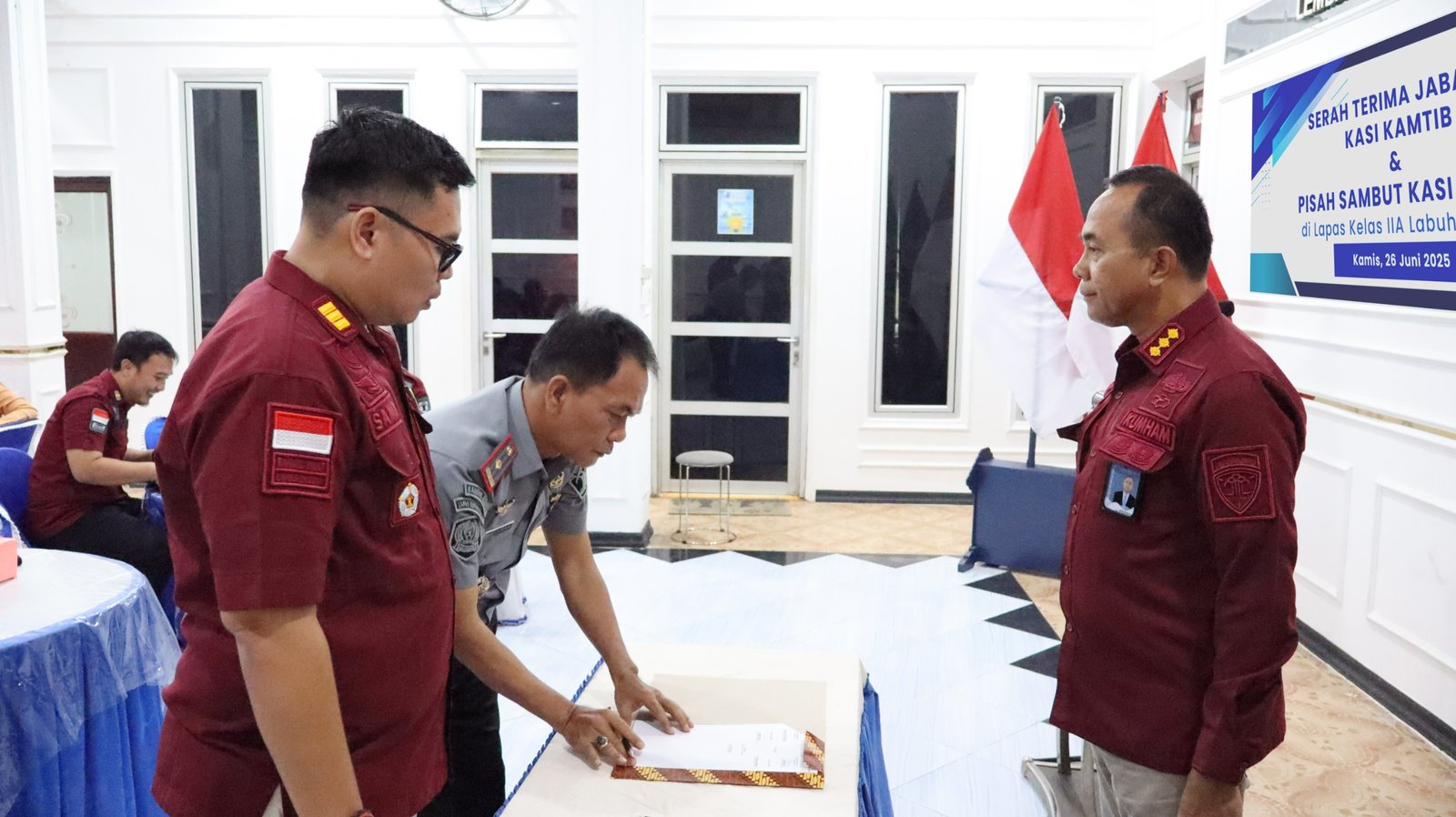 Batu Bara | Lembaga Pemasyarakatan (Lapas) Labuhan menggelar prosesi serah terima jabatan (sertijab) untuk posisi Kepala Seksi Administrasi Keamanan dan Ketertiban (Kasi Kamtib), Kamis (26/06). Jabatan tersebut resmi diserahkan dari Haris Damanik kepada penggantinya, Samuel Joga Marsahala Siregar.