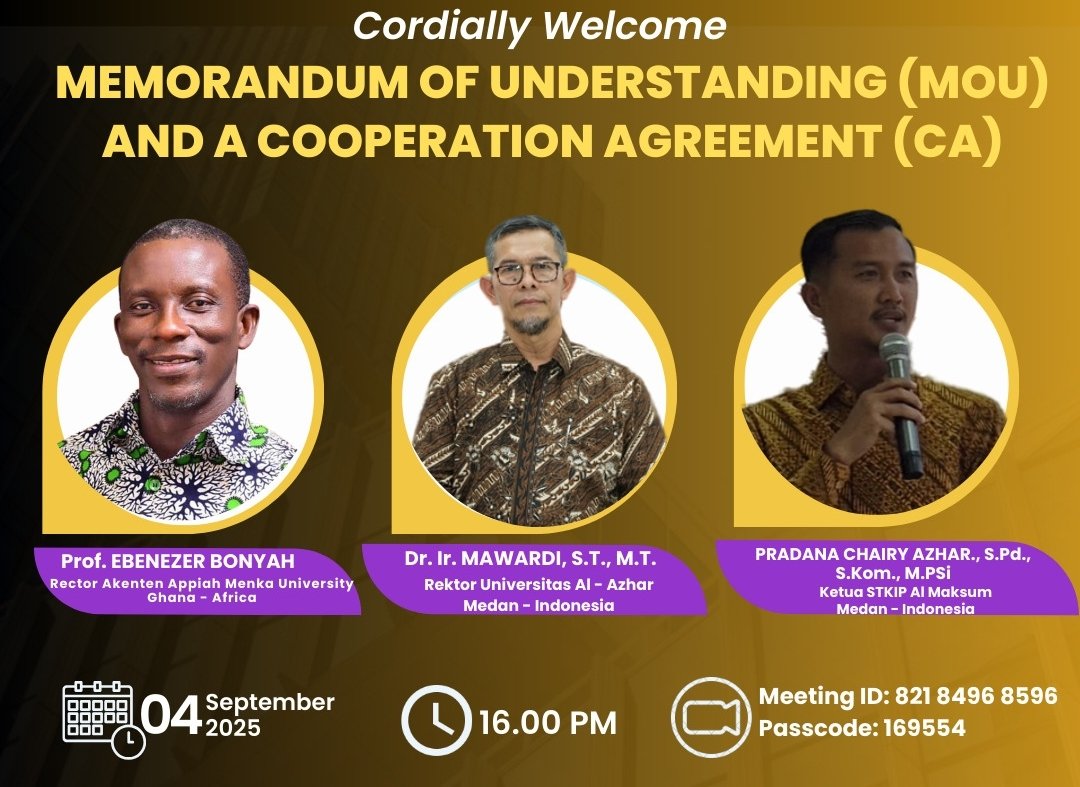 Medan, 4 September 2025 – Universitas Al Azhar terus mempertegas kiprahnya di kancah global dengan menggandeng Akenten Appiah Menka University (AAMU) Ghana dalam Rencana Pelaksanaan Memorandum of Understanding (MoU) internasional. Kolaborasi ini juga melibatkan STKIP Al Maksum Langkat sebagai mitra strategis dalam penguatan ekosistem akademik yang berdaya saing dunia.
