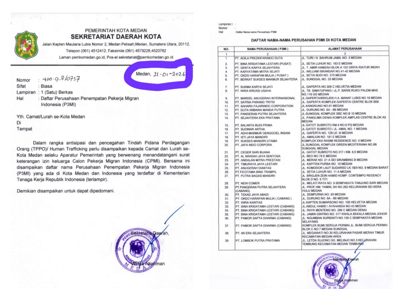 Permintaan pemeriksaan ini semakin menguat setelah terbitnya Surat Sekretariat Daerah Kota Medan Nomor 400.9.8/0737 tanggal 21 Januari 2026, yang berisi daftar lengkap perusahaan P3MI di kota tersebut. Surat tersebut dikeluarkan tidak lama setelah aksi yang digelar Aliansi Masyarakat Peduli Korban TPPO pada hari yang sama, yang bertempat di halaman Kantor Walikota Medan dan Kantor Dewan Perwakilan Rakyat Daerah (DPRD) Medan.